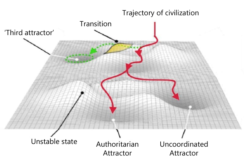 Authoritarian attractor: In response to crisis, or as an attempt to solve coordination problems, power centralizes into dystopian authoritarian structures that use surveillance, social control, and potentially AI to maintain order.