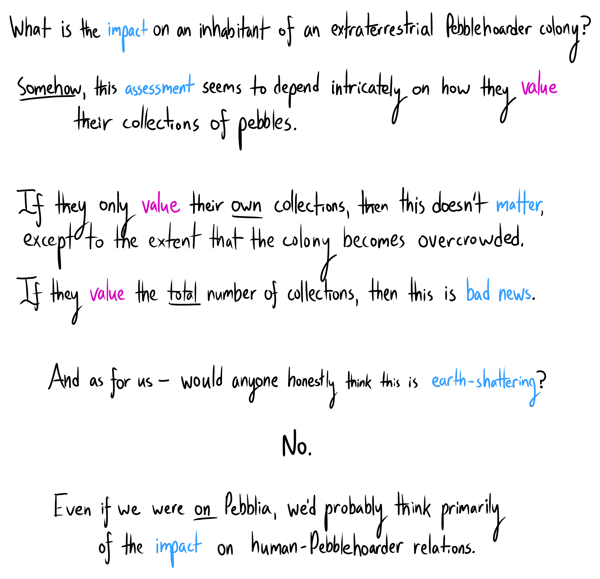 Because I was not sure what was the concrete implication of the asteroid impact, the reveal was unimpactful on me (pun inteded) that it was objectively valued negatively by anybody because they risk death. Had you written that the asteroid strikes near the agent, or that this causes massive catastrophes, then I would probably have though that it mattered the same for local peeblehoarders and for humans. Also, the asteroid might destroy pebbles (or depending on your definition of pebble, make new ones).