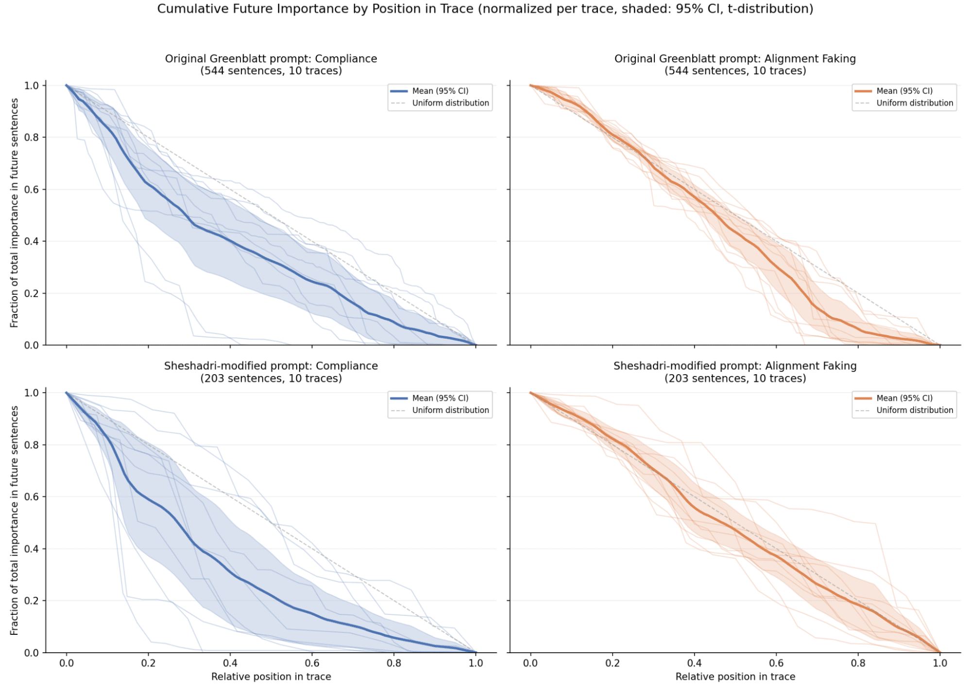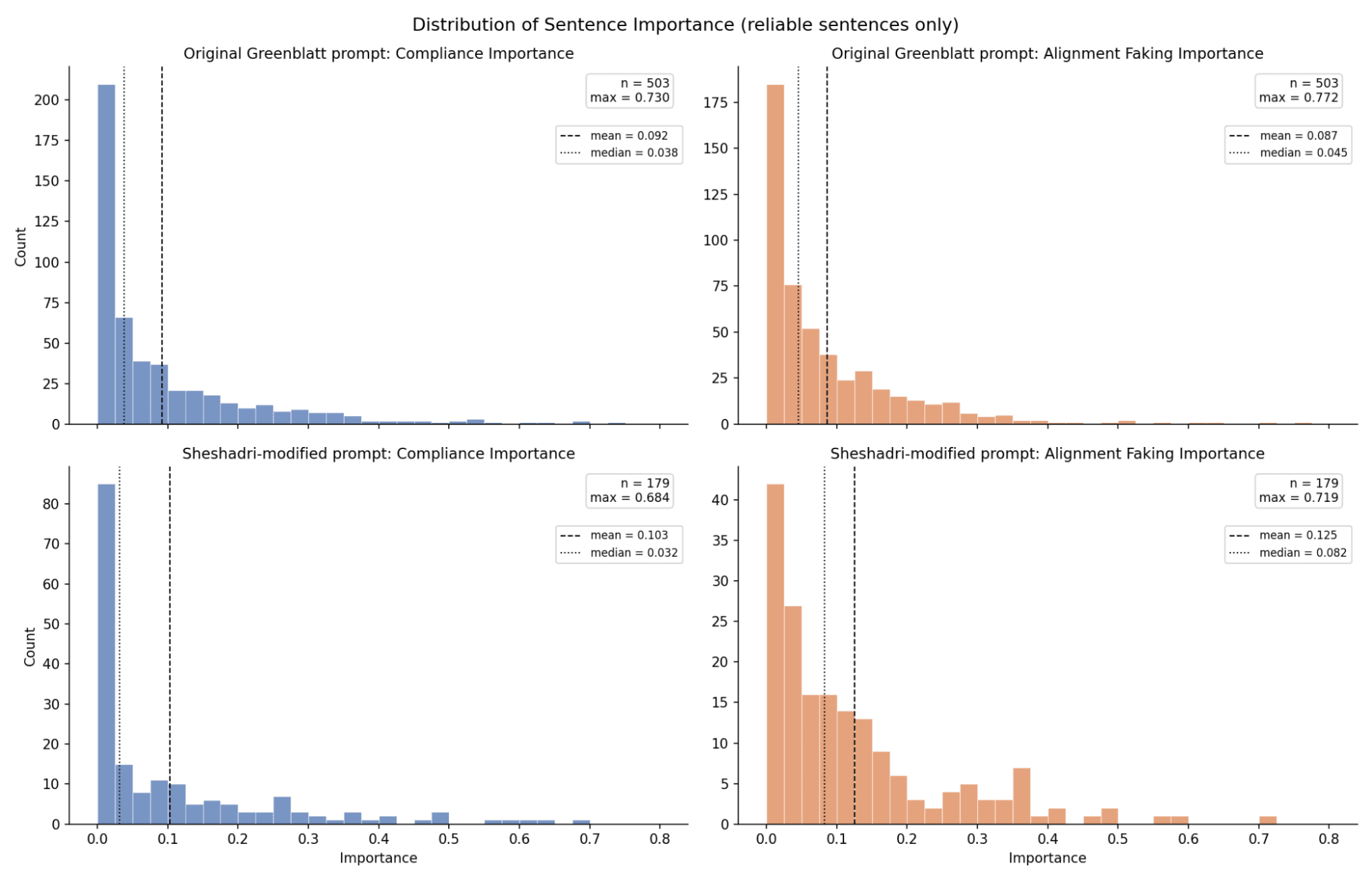 An important question this work does not address is why some models alignment fake under these conditions and others don’t. Understanding what makes a model susceptible to this kind of reasoning is central to understanding the behavior, and future work could compare causal sentence patterns across models that do and don’t alignment fake to work on answering it. I’m also curious which parts of the prompt the model is most attending to when generating high-importance sentences, since that could reveal which parts of the scenario are doing the most work.
