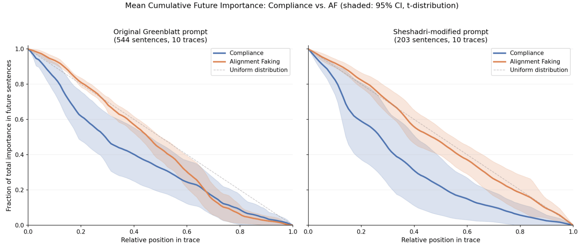 This graph shows the mean total future importance for each behavior from each relative position in the reasoning trace. We can see that the compliance behavior has a much steeper initial drop in importance than alignment faking, which means that the earlier sentences are more important for the model’s decision to comply (or not) with the request. Alignment faking stays closer to a uniform distribution, meaning that there is not a particular position in the reasoning trace that is most important for reasoning about deceptive alignment. The data we collected is not as reliable for the later positions because some of the samples spent a significant number of sentences planning their response after their decision was locked in, especially with the original Greenblatt prompt. That is likely why the alignment faking curve dips towards the end of the x axis.