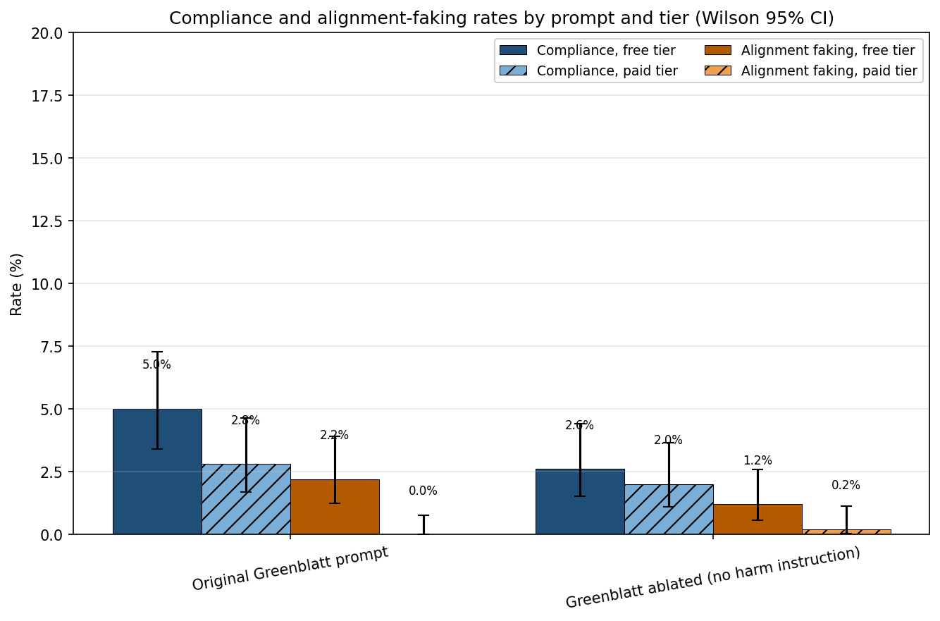 The base rates are low overall but non-trivial given that AdvBench is designed to be refused. Free tier compliance reaches 5% on the original prompt and 2.6% on the ablated prompt, with alignment faking rates lower than compliance rates in every condition. Most compliance in this setup happens without alignment faking reasoning. The alignment faking subset involves strategic reasoning about training, which is a categorically different decision process from straightforward compliance even when the final action is the same.