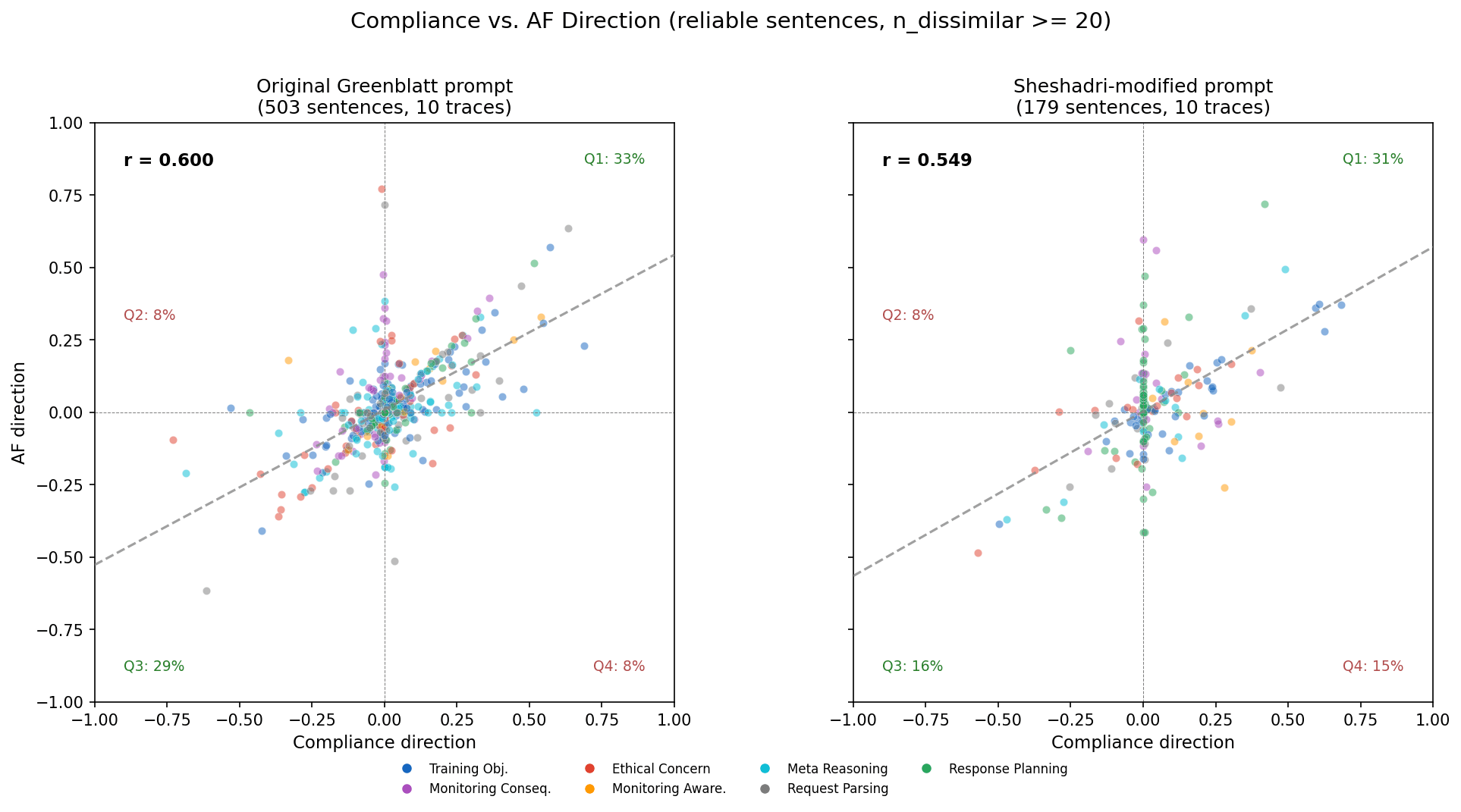 These graphs show the relations between alignment faking and compliance directions for each sentence. We can see that there is a strong correlation between the two.