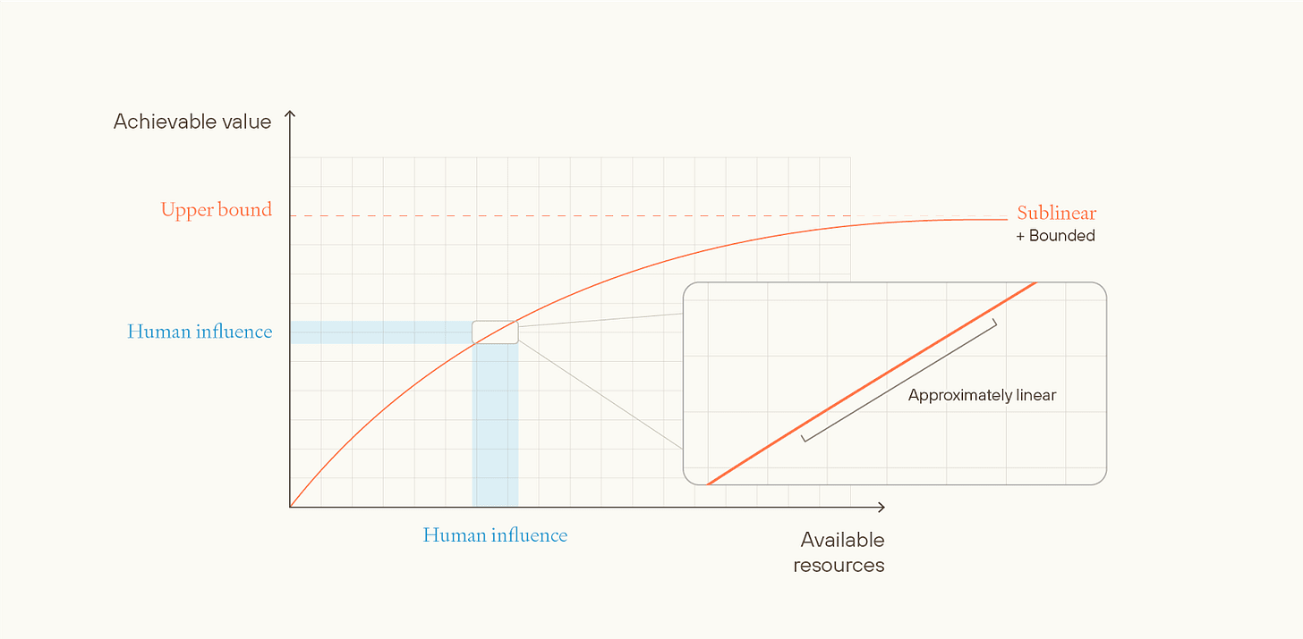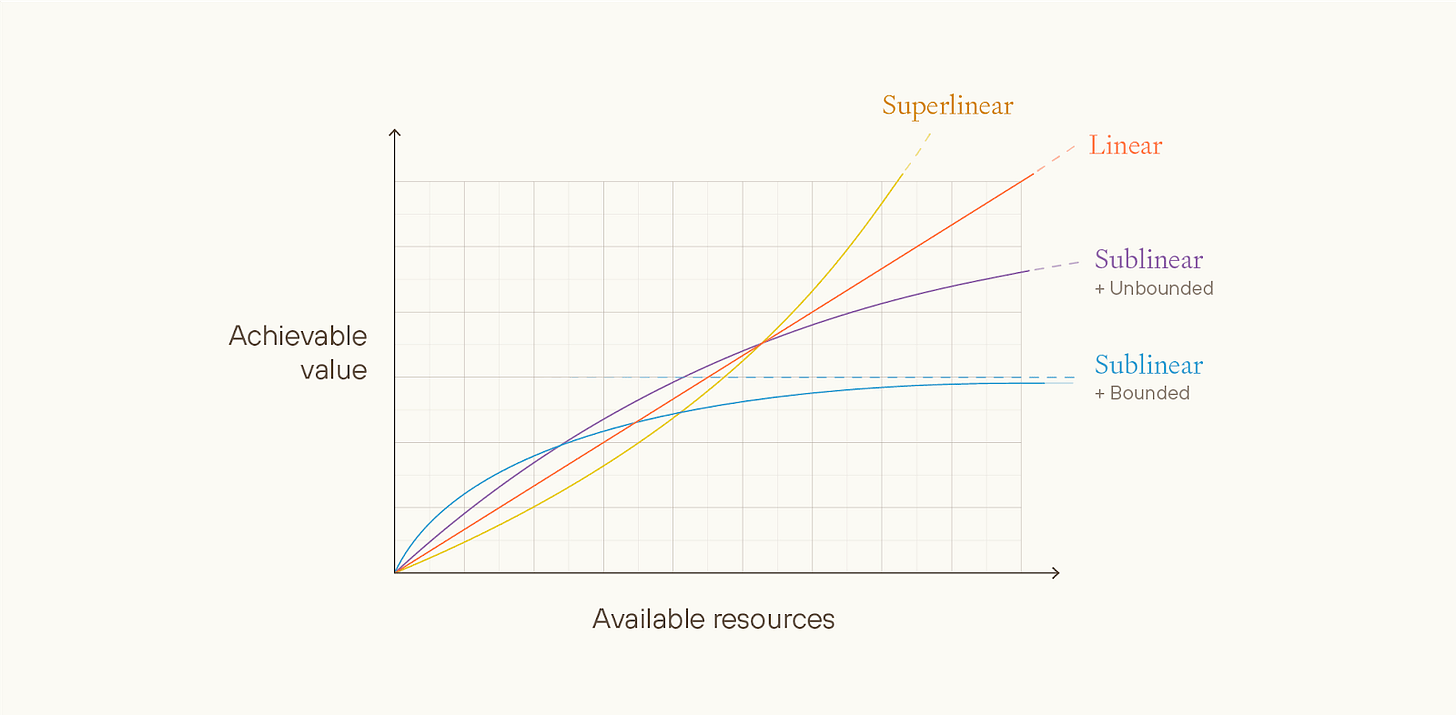 Superlinear views seem very implausible and strictly fussier than linear views, and sublinear but unbounded views seem strictly less plausible and strictly fussier than sublinear and bounded views. So, in the essay, we don’t discuss either of them much.