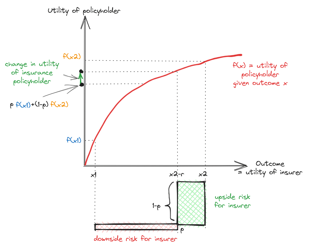 Another way of describing the core function of insurance is as arbitrage between differently-locally-concave utility functions. Assume the policyholder faces a gamble between a good outcome x2 and a bad outcome x1. If the policyholder’s utility function is more concave than the insurer’s (for example, if it’s the red line below, while the insurer’s is just linear), then the policyholder cares less than the insurer about the difference between x2 and x2 minus the insurance premium rate r. If the policyholder’s utility function is f, the policyholder’s utility change given insurance is a rise from pf(x1)+(1−p)f(x2) (where p is the chance of the bad outcome) to just always being f(x2−r), while the insurer is exposed to upside risk (1−p)r (green rectangle) and downside risk p(x2−x1−r) (red rectangle). The flatter the policyholder’s utility function is around the x2−r to x2 region compared to the region before that, the better this trade can be.
