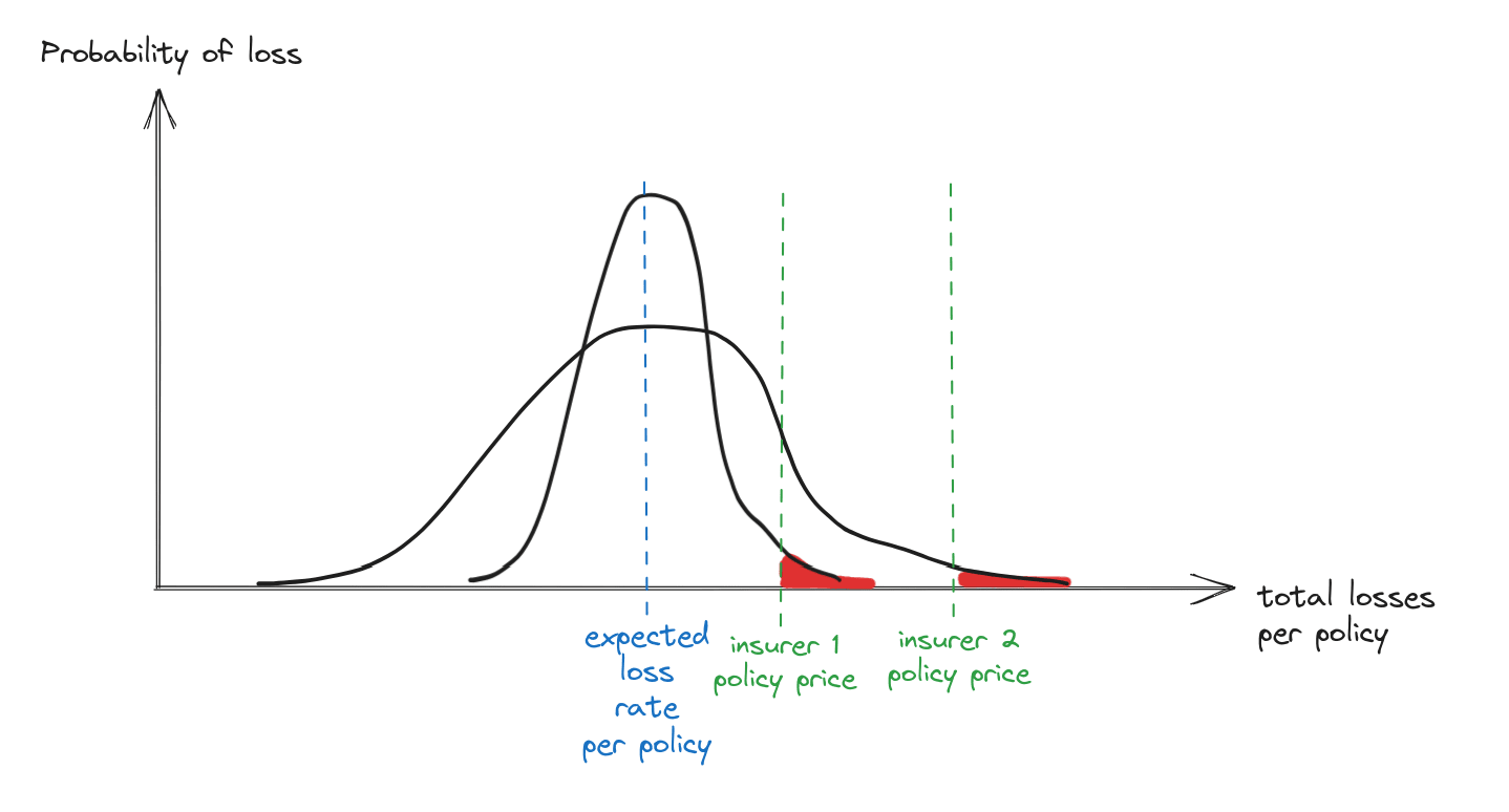 Therefore, even if the expected loss is the same between two insurers, assuming the same risk tolerance (a red area), the insurer with more policies is exposed to less variance in expected loss per policy and can set a lower price: