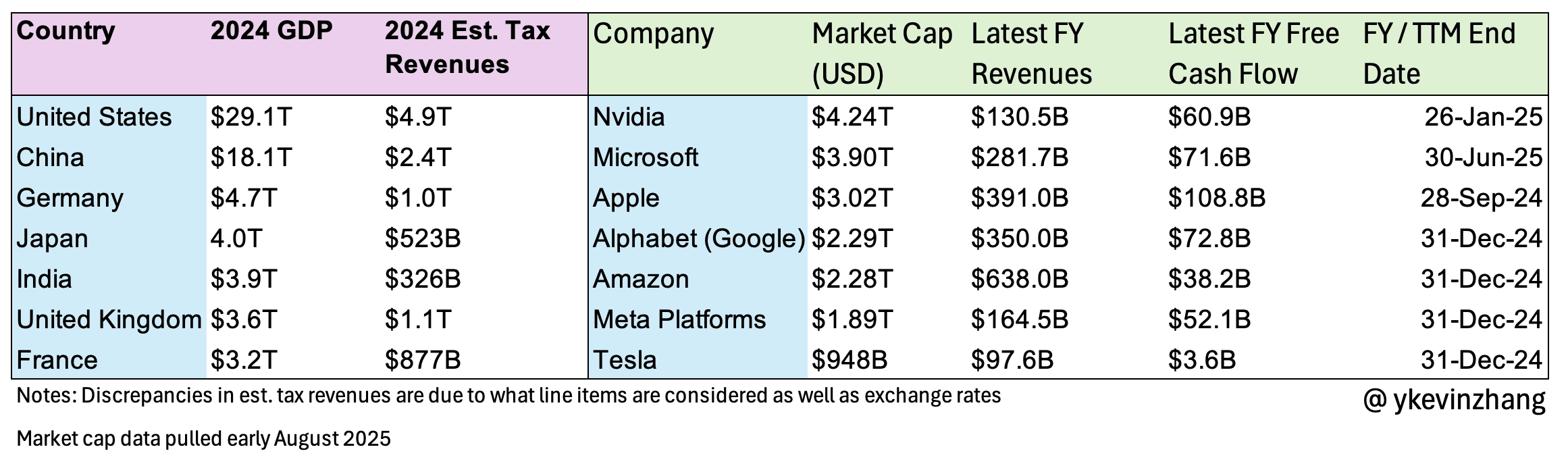 Meta has gone a step further. Mark Zuckerberg is on a personal crusade to acquire top AI talent: “investing” in AI startups (Scale AI for $14B), poaching researchers for hundreds of millions of dollars, and even buying out venture funds. To understand the scale of capital being deployed, I pulled the tax revenues of the top seven countries by GDP alongside some high level stats for the Magnificent Seven.