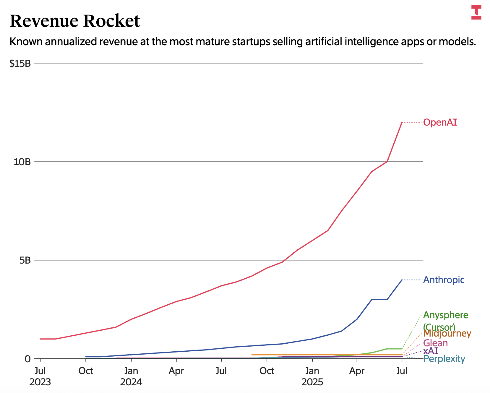 As a result, startups like OpenAI, Anthropic, and xAI needed to raise tens of billions of dollars to build / lease data centers to train & serve their models. OpenAI and Anthropic were able to leverage their initial technology edge to establish distribution (via applications like ChatGPT). With that initial distribution, they’ve earned the right to raise tens of billions more to compete with tech incumbents. xAI, a recent entrant to the game, leveraged Elon’s personal net worth, a cadre of friendly venture firms, and interesting financial engineering to come up with the dollars needed to try to catch up. The rapid revenue growth of startups like OpenAI and Anthropic brings us to the next interesting dynamic — the competitive response from Big Tech.