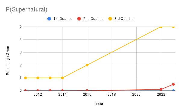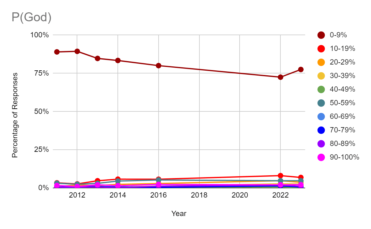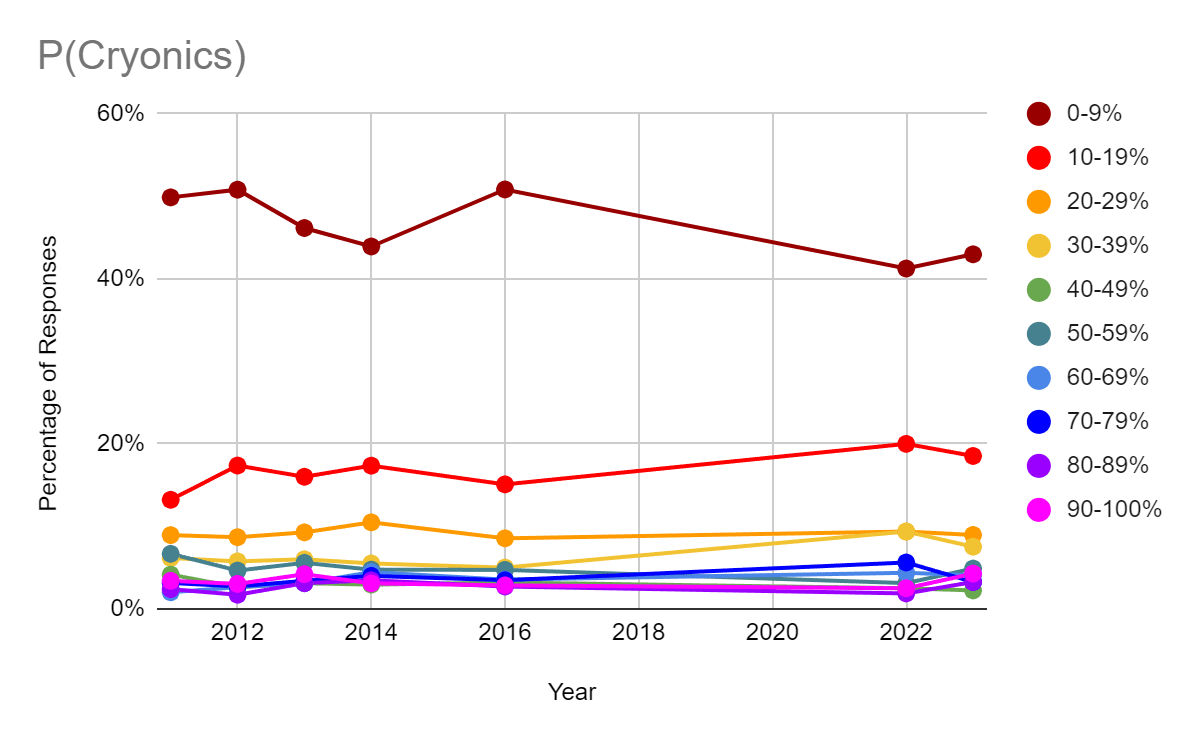 This is a question whose answer I want to keep an eye on over time. I don’t expect the next hundred years to give us any new insights into whether God exists, and I wouldn’t expect the next ten years to give us much in the way of new updates as to whether aliens exist, but if cryonics does work I’d expect a slow rise over time as the tech got better and better. Maybe that’s wrong though; if I imagine a similar survey of whether powered flight and airplanes would ever work that graph would have had a very sudden and unexpected spike in 1903.