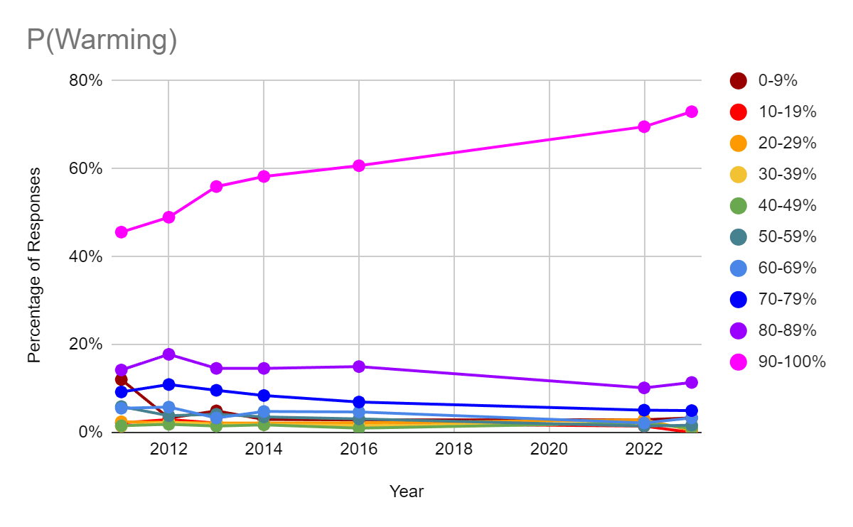 Secondly, is there new evidence gradually showing up? If I just eyeball that mostly-linear-looking line, it suggests everyone on LessWrong will believe global warming around 2037 and nobody would have believed it around 1980. That linear extrapolation is probably nonsense, but something happened to shift 20% of the responses.