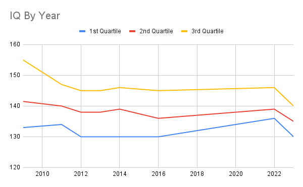 Doesn’t it look like the second and third quartiles are lower than they used to be? Like, AFAICT, if you ignore 2022, you just have downward trends in those quartiles of reported IQ.