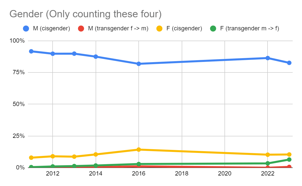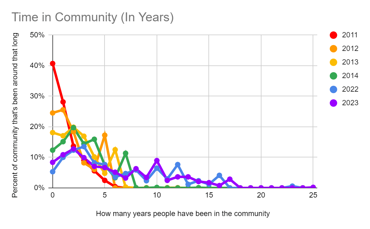 This is also the tenth such survey that’s been run. We missed a proper ten year anniversary in 2019, and in 2022 I was mostly focused on making the survey happen at all. Still, this is a cool milestone, and in celebration I’m going to be dipping into the datasets from previous years a lot. Unfortunately that doesn’t mean I have ten surveys worth of data; bit rot and the rotation of census runners means I only have access to about half of these.