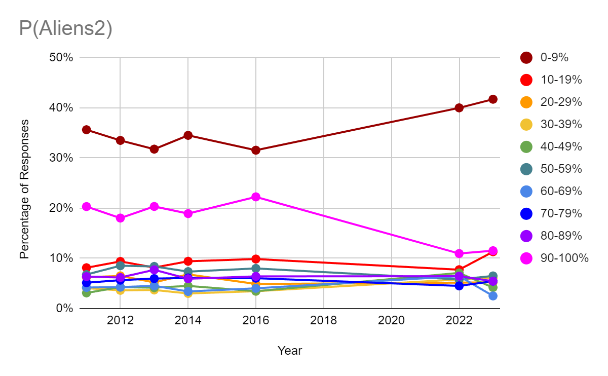 In this one, I bucketed the answers into ten groups and gave each group its own line, with the vertical axis being what percentage of answers fell in that group. Here for instance, in 2023 about fifteen percent of people said many worlds hypothesis was between 90 and 100% likely to be true. Sometimes there’s weird swings in particular percentages; for instance for Many Worlds the confident believers have a steep drop and then a rise over the years, while there’s less overall swings in the moderate doubters (the 40-49% bucket.) This was useful for eyeballing if there were particularly popular ranges; for Many Worlds there’s a fairly balanced mix of everything. If you look at Aliens, you see one particular grouping stood out.
