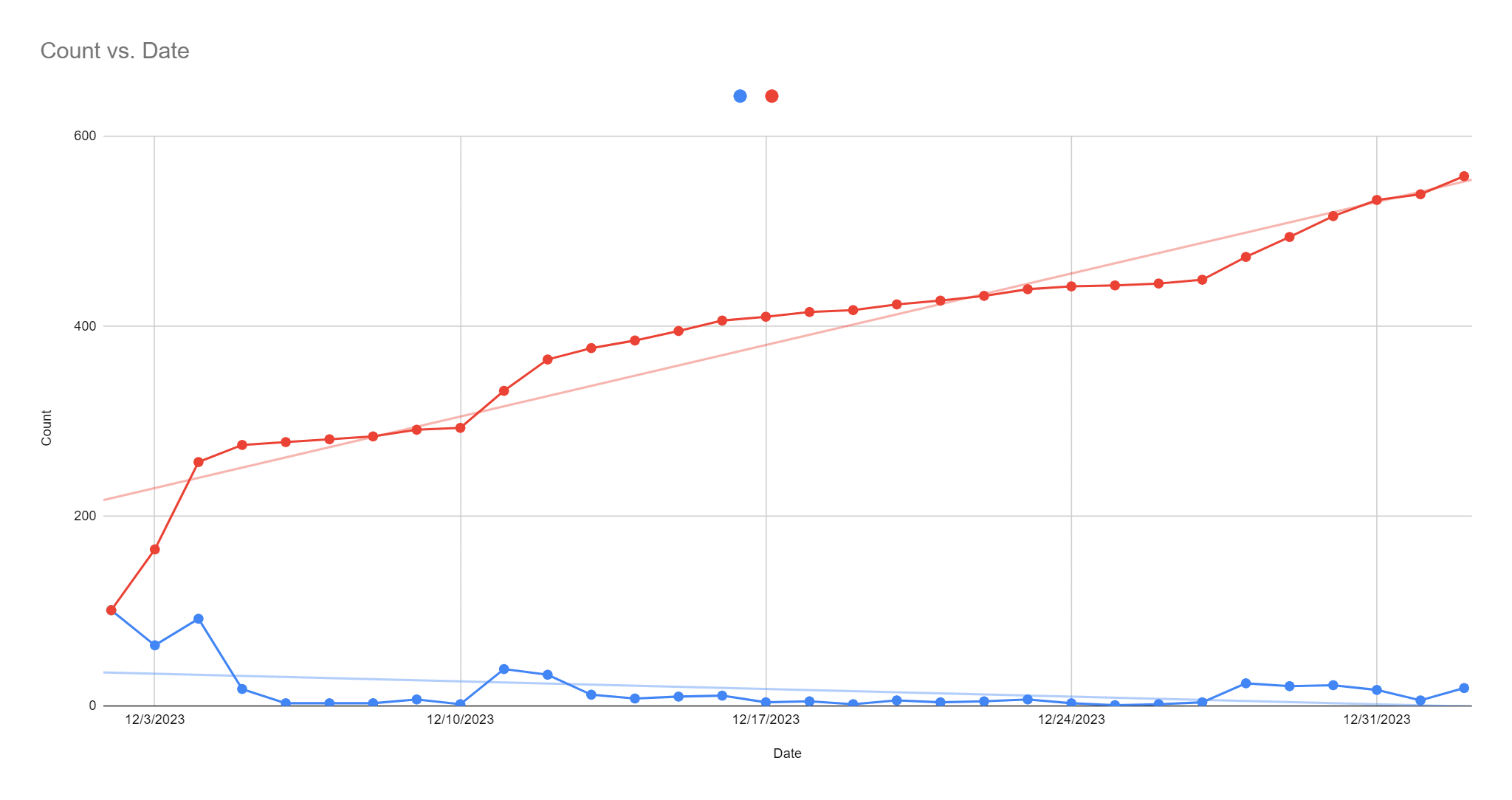 So here’s the part where I get totally baffled. Look at 2023. See that rise on December 28th towards the end? That’s LessWrong putting a banner on the front page. I don’t think literally everyone who visited LessWrong over those three days saw the banner, but most of them did.