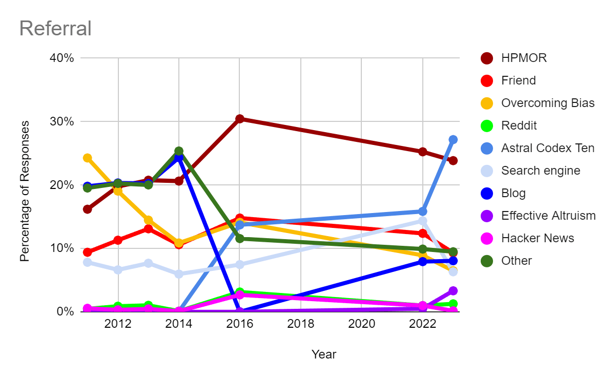 This one is also highly relevant to my interests. HPMOR continues to be outstanding as a source of referrals and it’s still creating new referrals. I didn’t bother putting “Other Fiction” on this chart even though it’s been an option, because even when it’s an option it brings in about 1% of answers. If the LessWrong team asked me how to drive more traffic to the website, my answer would be to get Yudkowskyto write another popular fanfic and mention LessWrong in the author’s notes.