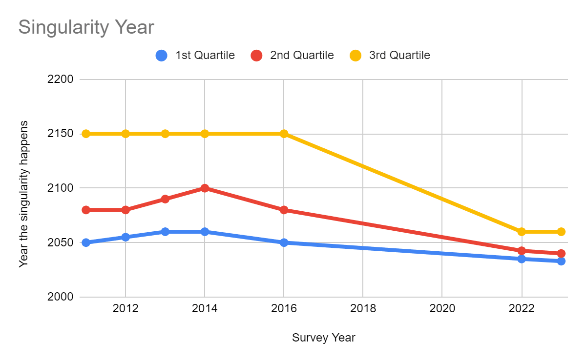 This makes directional sense to me. In 2016 if you look back at the last five years in AI advancement, there aren’t that many resources being thrown at this or many rapid public advancements being announced. In 2023, yeah, the last five years feels like a wild ride and maybe the singularity went from something your grandkids would have to deal with to something that’s going to happen in your lifetime.