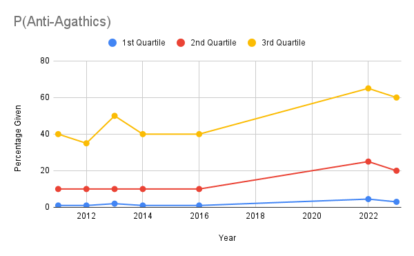 The question text is basically the same year to year, with the only difference I noticed between any versions being when to leave the question blank. This is a numeric question without any of the judgement calls I make elsewhere about how to bucket things. And yet the median answer in 2022 is lower than the 1st quartile in 2016, and the 3rd quartile in 2022 is lower than the median in 2016. Also, what is up with the 3rd quartile staying perfectly at 2150 for five surveys straight? I’d expect it to wiggle around a little bit like the 1st quartile does. I was suspicious I was screwing up the data query somehow, but I checked a few of the previous Results posts and saw the same 3rd quartile.