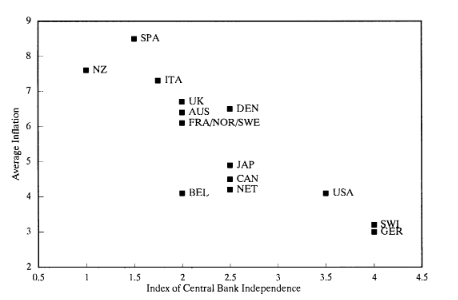 To be more bland, here’s a graph from 1993 paper by Alesina and Summers showing how inflation rate correlates with the independence of the central banks from the politics:
