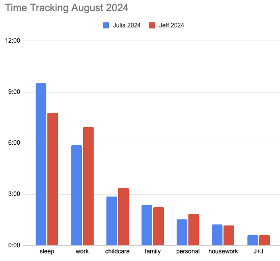 There is also work that mostly takes attention and not time, which isn’t something we’re capturing here. Some things Julia is responsible for include planning the kids medical care, interfacing with the school, and hiring and managing childcare providers. Similarly I’m responsible for tracking what maintenance the house needs, coordinating with contractors, and handling issues from our tenants. I don’t know how these kinds of mental overhead tasks shake out since we don’t track them.