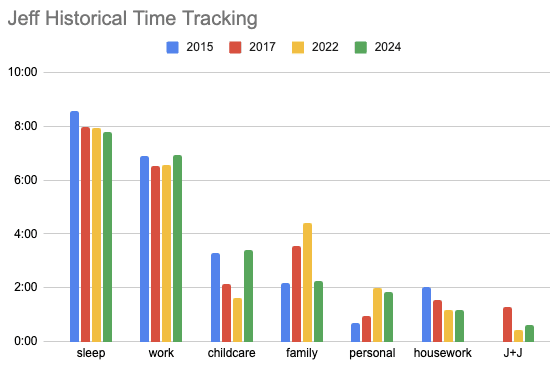 The no Jeff+Julia time in 2015 is another coding thing: I didn’t break that out separately from “personal” then. But I think there was still very little time for just the two of us because we were still working shifted schedules to handle childcare with a tricky kid. The lots of Jeff+Julia time in 2017 was us happening to pick an unusual week to track.