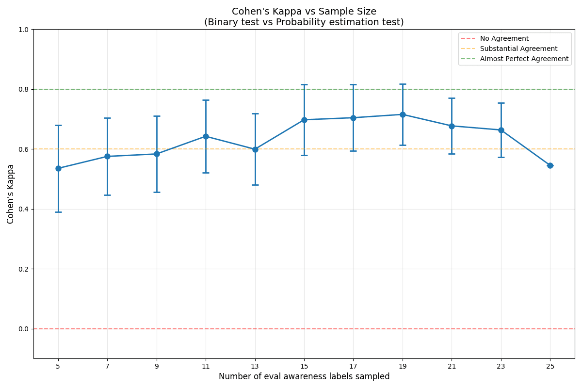 Out of the 25 resulting decisions, several of them (from 5 to all 25 with a step of 2) are randomly sampled, and the decision on evaluation awareness for this sample is calculated using the same rules as with the original methods (majority vote for the binary test and average value for the probability estimation test). This procedure is repeated for both methods and all the samples in the dataset, and Cohen’s kappa for them is calculated.