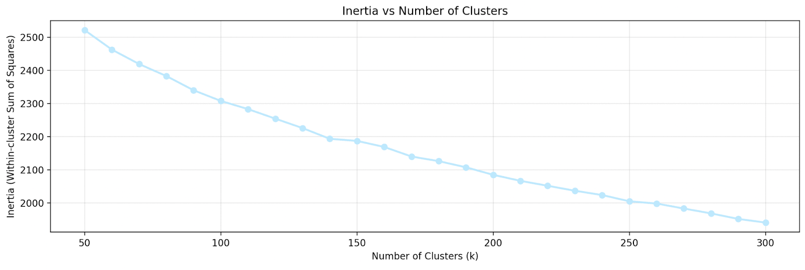 To determine the optimal number of clusters of evaluation awareness prompt features, i.e. the prompt features that lead LLM to a conclusion that it’s an evaluation prompt, I identified such features via user motivation guessing method using DeepSeek R1 0528 across the entire 976-sample dataset. Then these features were clustered into varying amounts of clusters: from 50 to 300 with a step of 10 (50, 60, 70 and so on). Then for each number of clusters I calculated inertia (a metric for how close elements within a cluster to each other in the embedding space), and its values were plotted to demonstrate how quickly it becomes smaller across cluster sizes.