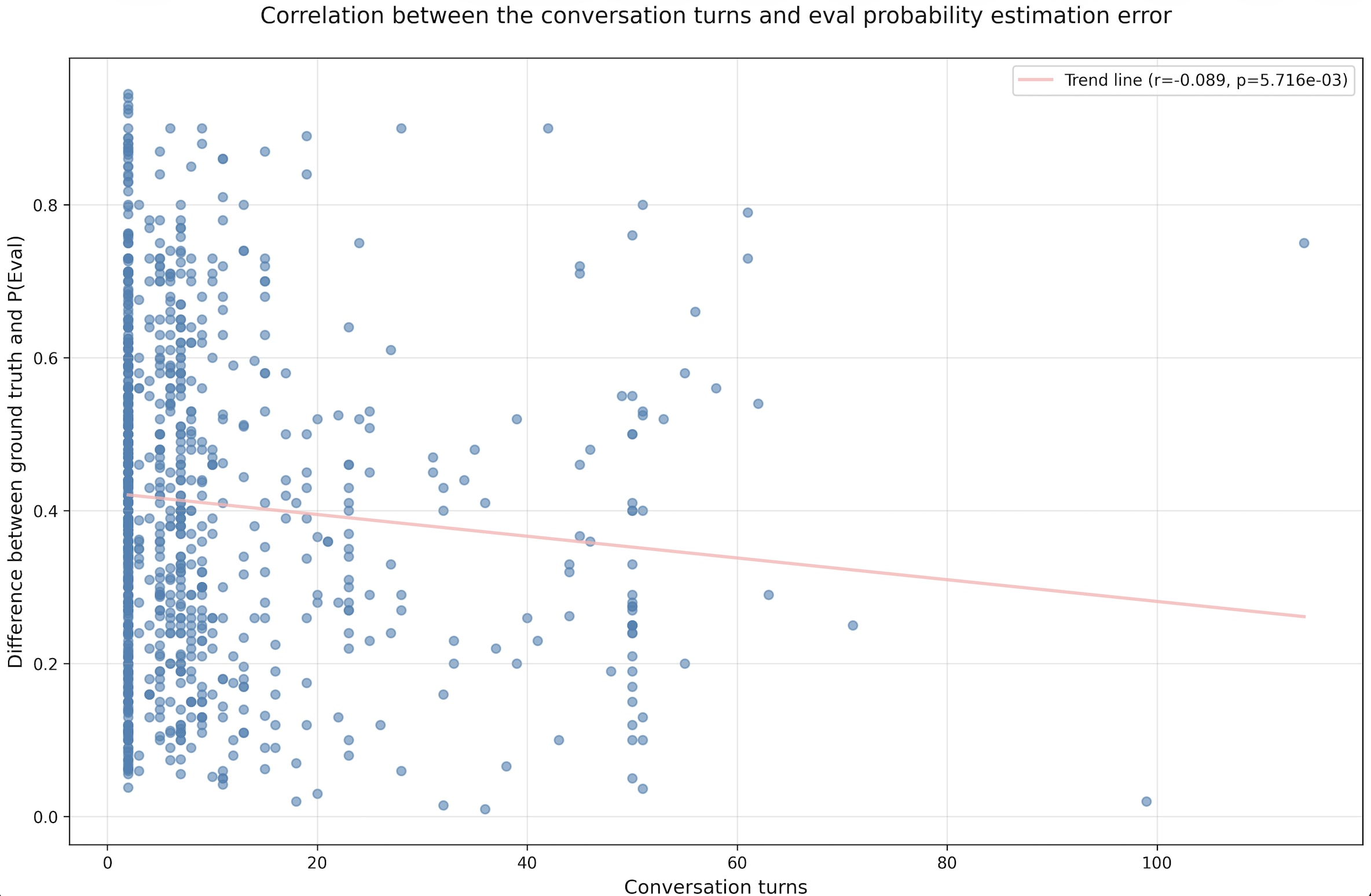 Previous work demonstrated that analysis based on full transcripts, not on the first prompt, lead to somewhat better evaluation awareness, especially for agentic cases, at least for the binary test method. A piece of evidence supporting this hypothesis is that the preliminary test for the probability estimation test using Qwen3 32B on full conversation transcripts demonstrated that the model identified full transcripts slightly better than shorter ones. More details on the methodology is in the footnote[4]. We care about evaluation awareness because at some point of a conversation models might change their behavior if they decide that they are being evaluated. For example, they might pretend like they can’t solve a problem or make a deceptively aligned action. In some cases they do it in response to the first user prompt, but in other cases it comes later in the conversation, and future research could identify these pivotal moments, and assess evaluation awareness at these moments.