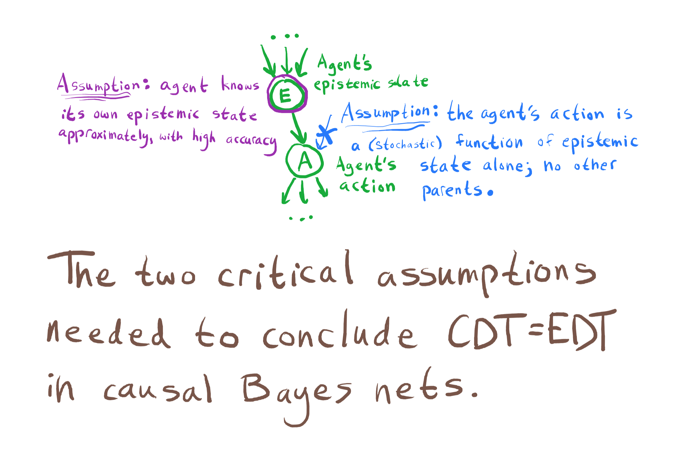 My CDT=EDT view came from being pedantic about how decision problems are represented, and noticing that when you’re pedantic, it becomes awfully hard to drive a wedge between CDT and EDT; you’ve got to do things which are strange enough that it becomes questionable whether it’s a fair comparison between CDT and EDT. However, I didn’t notice the extent to which my “being very careful about the representation” was really insisting that bayes nets are the proper representation.