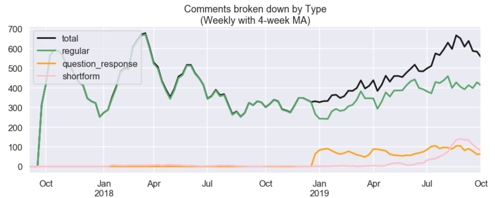 We see that the total number of comments (including all Shortform activity and all responses to questions) grew since July due to the introduction of Shortform while the number of regular comments did not shrink.