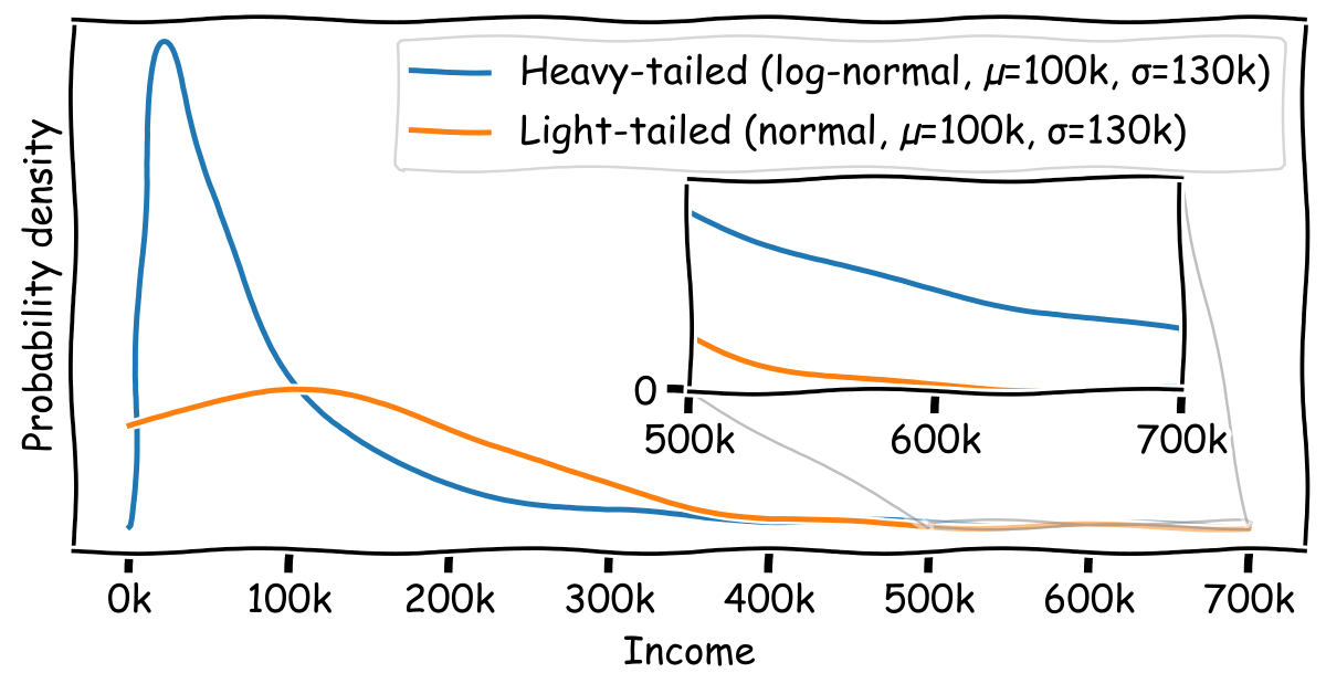 You can most easily see the difference between a heavy-tailed and light-tailed distribution on a plot. Here’s a plot comparing a heavy-tailed and light-tailed distribution with identical means and standard deviations, chosen to be similar to the distribution of household income in the US (median = $60,000; p99 = $600,000):