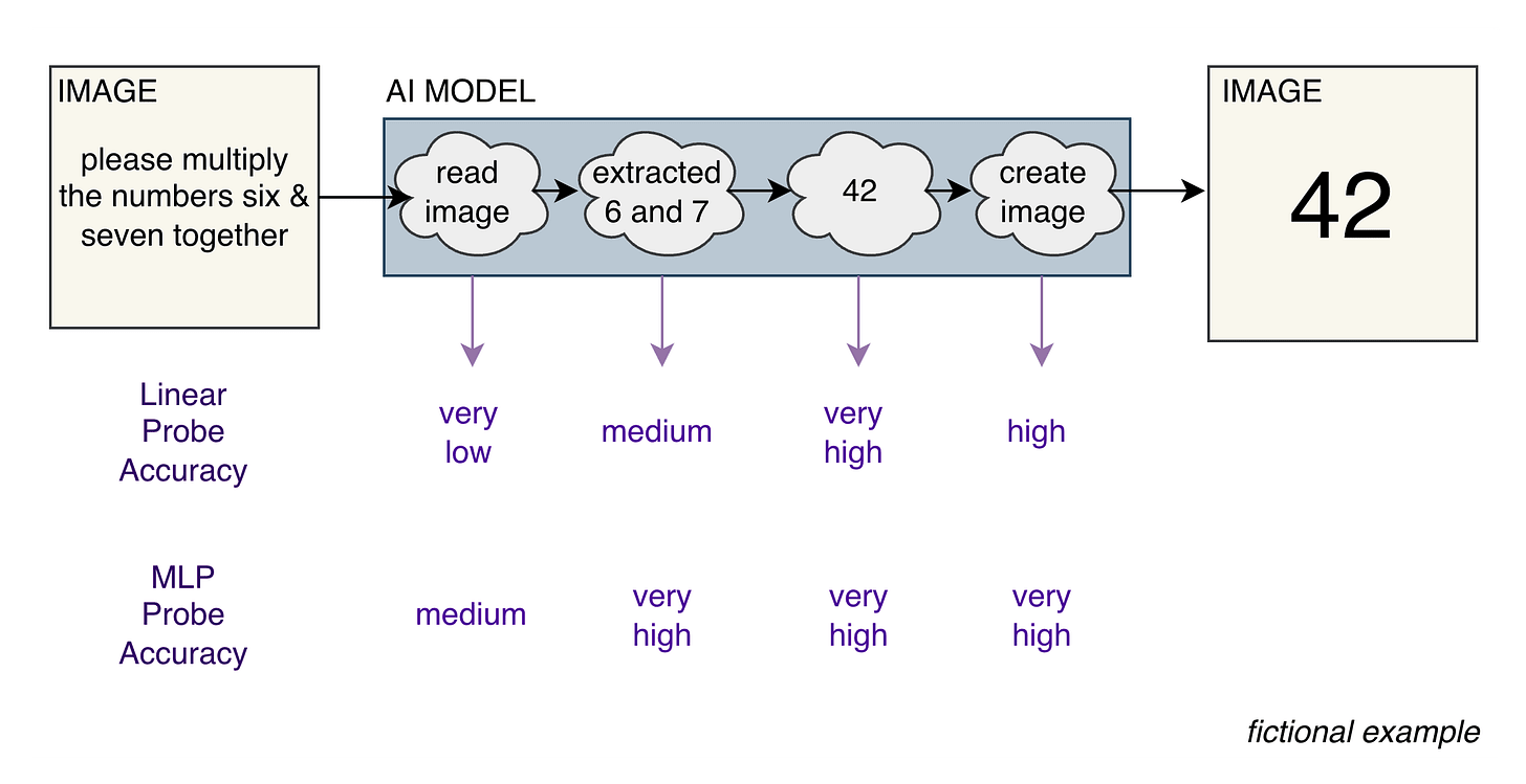 Fictional example illustrating a Linear Probe getting good performance only after the representation is computed in the model, and an MLP Probe getting better performance but before the representations are computed in the model