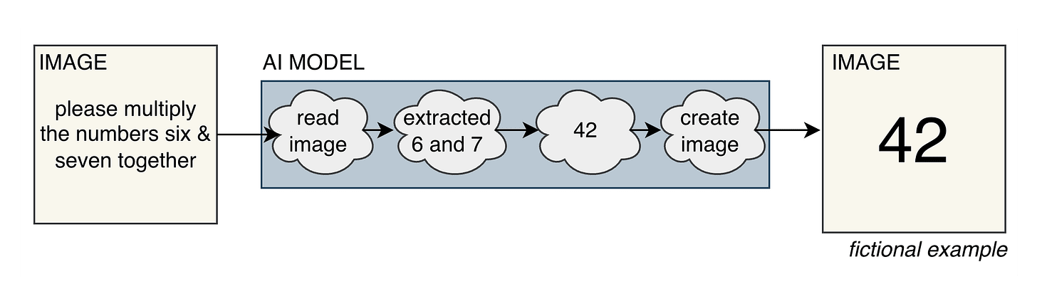 Suppose we have a model which needs to read in some pixel values, extract the numbers from those pixel values, do some math, then output a new image with the answer to that math. See illustration below.