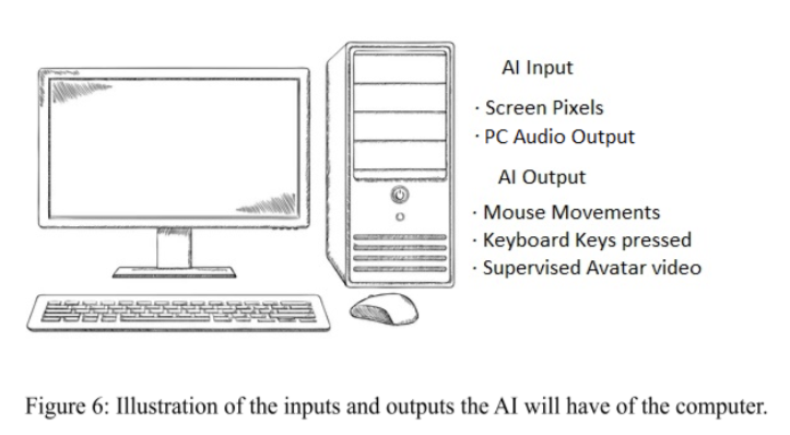 The AI is given control over a computer with internet access: this means that the AI is able to use the keyboard and mouse. For the webcam control, the AI agent will be given a profile so that it can do video calls. The information the AI receives are the pixels of the screen and the audio output.
