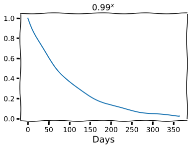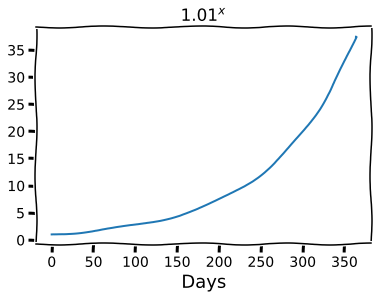 There’s a commonly repeated piece of wisdom about incremental improvement which says it’s important to know the difference between and as gets very large. If you are making 1% improvement per day at a thing, over a year your progress goes like this (note that because of decreasing marginal returns your metrics probably won’t go like this, but skill using some scale will):