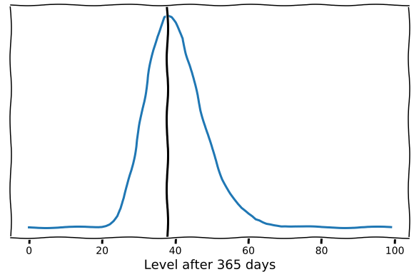 Here the rainbow lines are individual runs with variation, and the solid black line is the case with no variation. With the randomness there is a bit more uncertainty about where it ends up, but it’s still broadly clustered around the original, and we don’t see any of the samples collapse to zero. The final distribution of improvement after 365 days looks like this:
