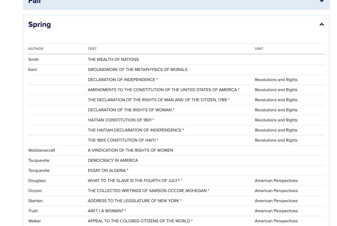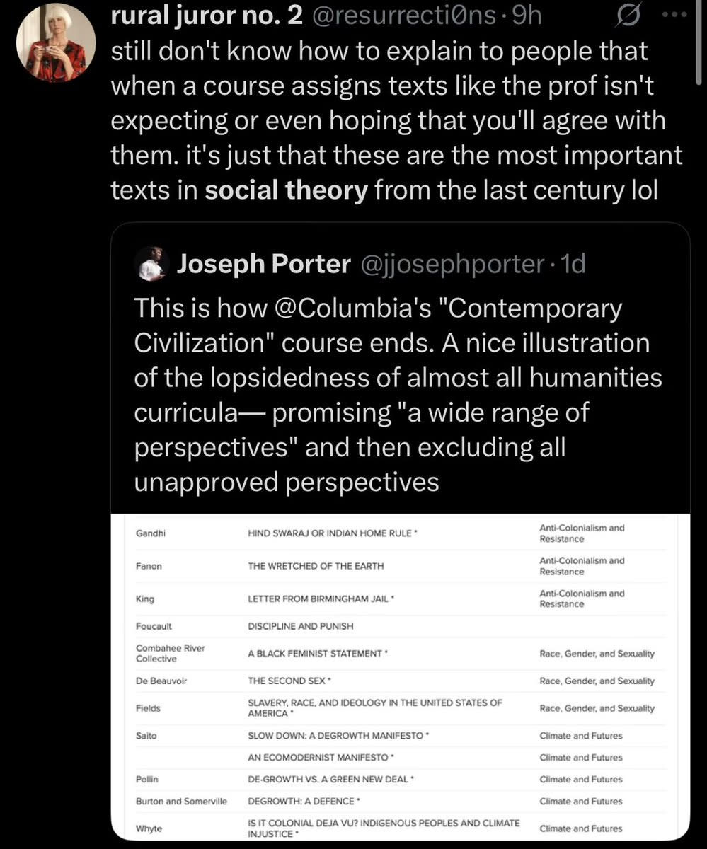 When I was forced to endure the Columbia Core Curriculum, I would not say I enjoyed my experience, but I understood why most of the books were there. Claude offers this summary, which mostly matches my experience but not entirely, and the ones that were added as optional (like Rawls and Marquez) seemed quite bad: