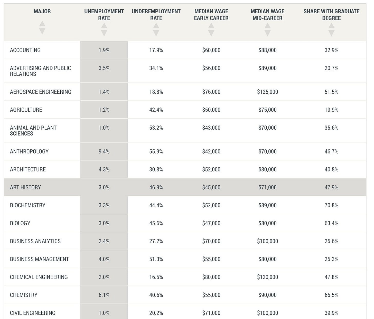 Each of these majors had unemployment rates of 1% or lower among college graduates ages 22 to 27. Art history had an unemployment rate of 3% and philosophy of 3.2%…