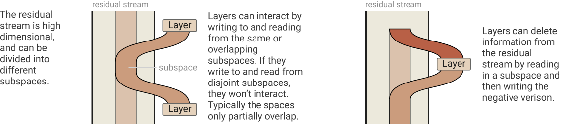 Another way of thinking about the residual stream is that it’s a communication channel for individual components of the transformer to talk through. This perspective was introduced in Anthropic’s first paper about mechanistic interpretability and seems to be the group’s take on the residual stream in general. Importantly, thinking about the residual stream as a communication channel or as an accumulation of output is not mutually exclusive, and, in fact, the accumulation of information about the output, seen in the logit lens, is probably being communicated to components deeper in the transformer.