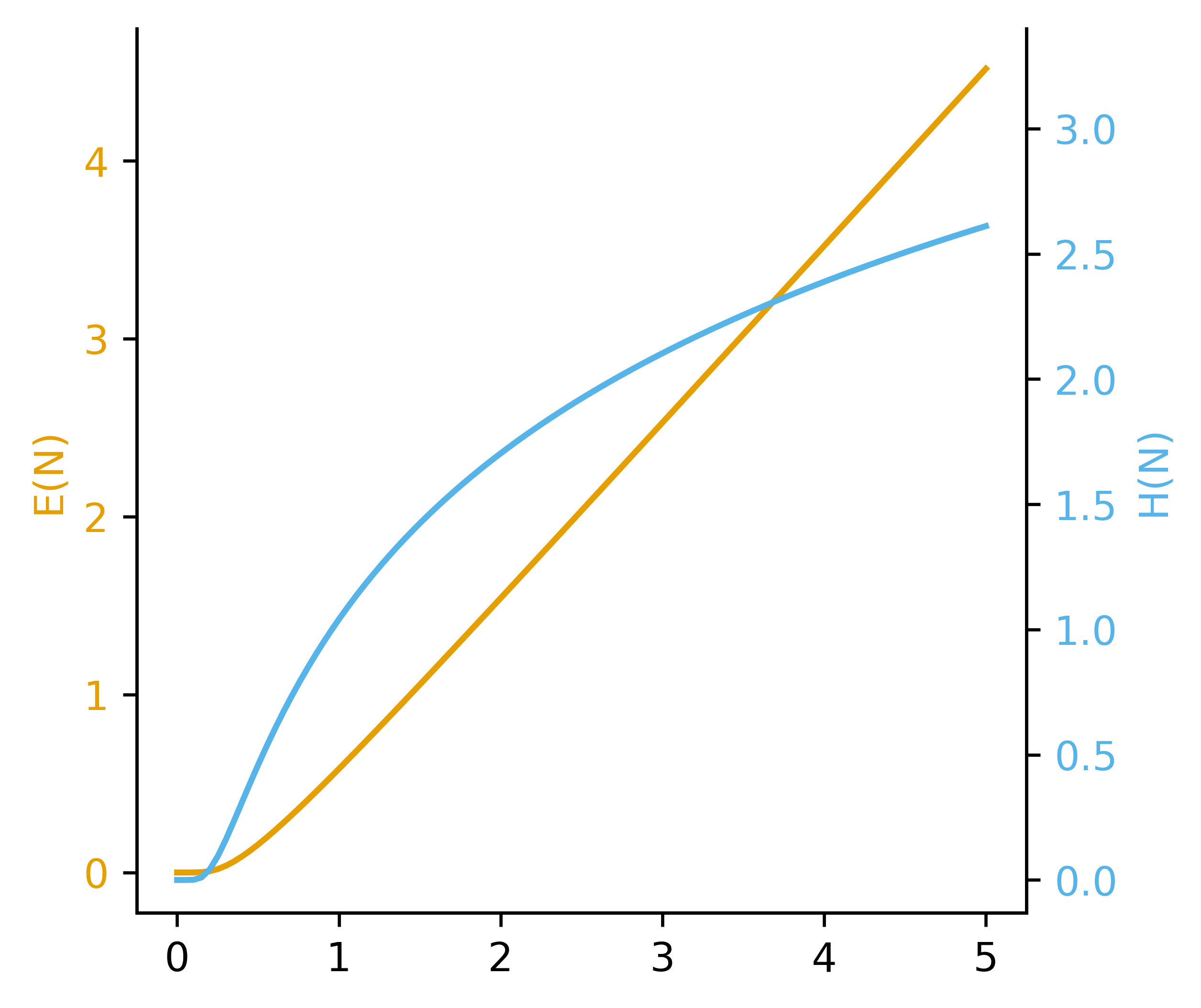 Let’s plot both E(N) and H(N) of our systems as a function of T: