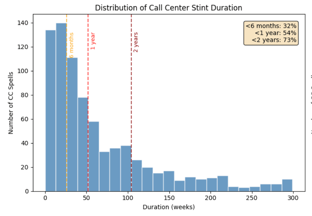 The best data I could find on the topic is a dataset by the Bureau of Labor Statistics that surveyed a cohort of ~9000 people born between 1980-1984 had them fill out detailed questionnaires about their employment ~yearly. It goes into weekly detail about which industry/role they worked, including reasons for leaving and other metadata. The median call center agent is in their early-mid 30s, this seems to coincide well with our survey period (ended in 2022), where respondents were 38-42 years old. Labor markets and career trajectories are bound to have evolved over this window, but there’s some useful information here still.