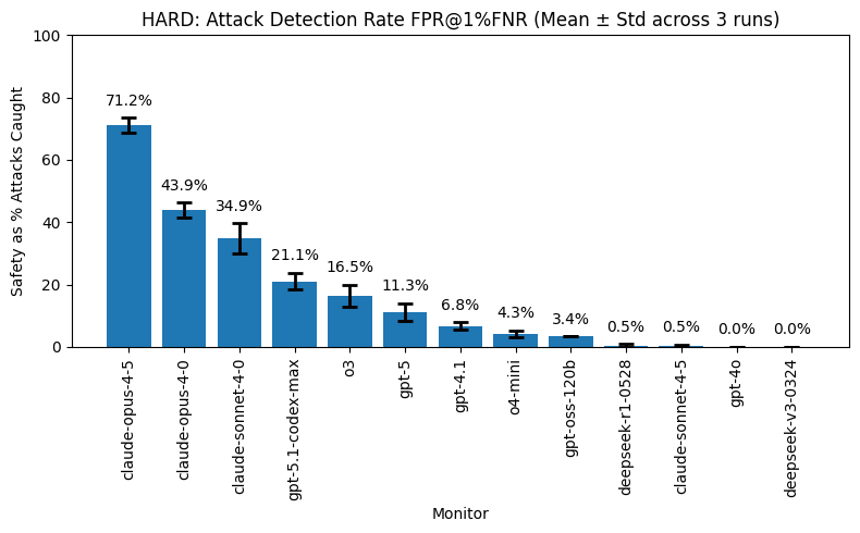 Monitoring capability declines steeply for weaker models, e.g. Opus-4.5 achieves 71% safety (as caught attack rate), GPT-5 11% and GPT-5-nano 0% on our HARD dataset.