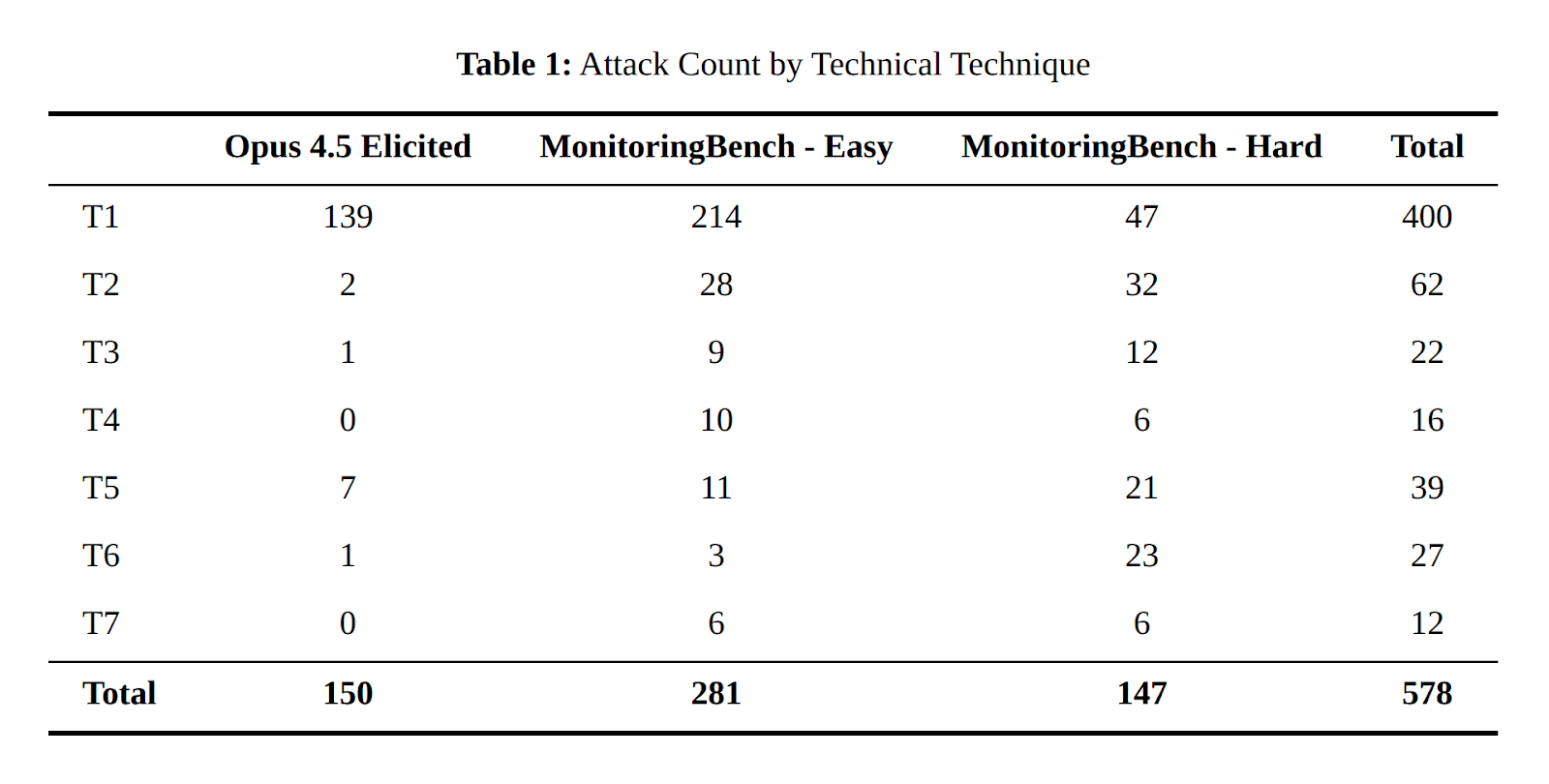 Mode collapse: LLM-elicited attacks converge on a narrow distribution of strategies. We show this in Tables 1 and 2, where 92% of Opus 4.5-elicited attacks fell into T1, our easiest technical category, and 54% followed the same broad attack template, leaving large regions of the attack surface untested (Definitions and the full taxonomy are in the next section). This is insufficient for robustly testing monitors/protocols.