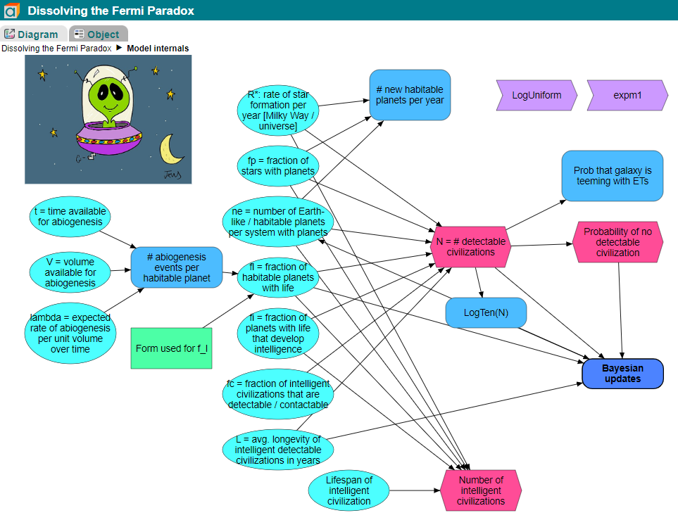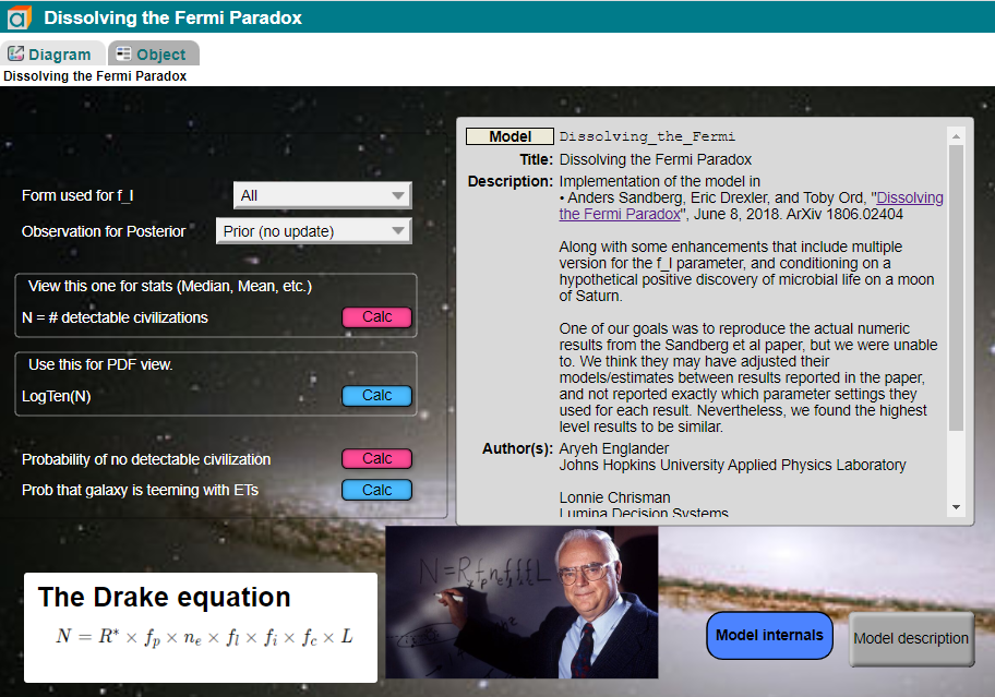 The omnipresence of uncertainty is part of why making predictions and decisions is so hard. We at Lumina advocate treating uncertainty explicitly in our models using probability distributions. Sadly this is not yet as common as it should be. A recent paper “Dissolving the Fermi Paradox” (2018) is a powerful illustration of how including uncertainty can transform conclusions on the fascinating question of whether our Earth is the only place in the Universe harboring intelligent life. The authors, Anders Sandberg, Eric Drexler and Toby Ord (whom we shall refer to as SDO), show elegantly that the apparent paradox is simply the result of the mistake of ignoring uncertainty, what Sam L. Savage calls the Flaw of Averages. In this article, we review their article and link to an Analytica version of their model that you can explore.