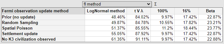 The versions that explored a less extreme model of f_l (the rate of abiogenesis) see a much bigger change. For example, when f_l is set to 100%, it changes from 10% for Milky Way to 0.05% for Virgo. The Beta distribution version of f_l goes from 23% to 1%.