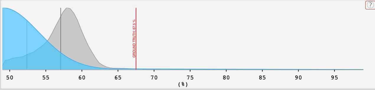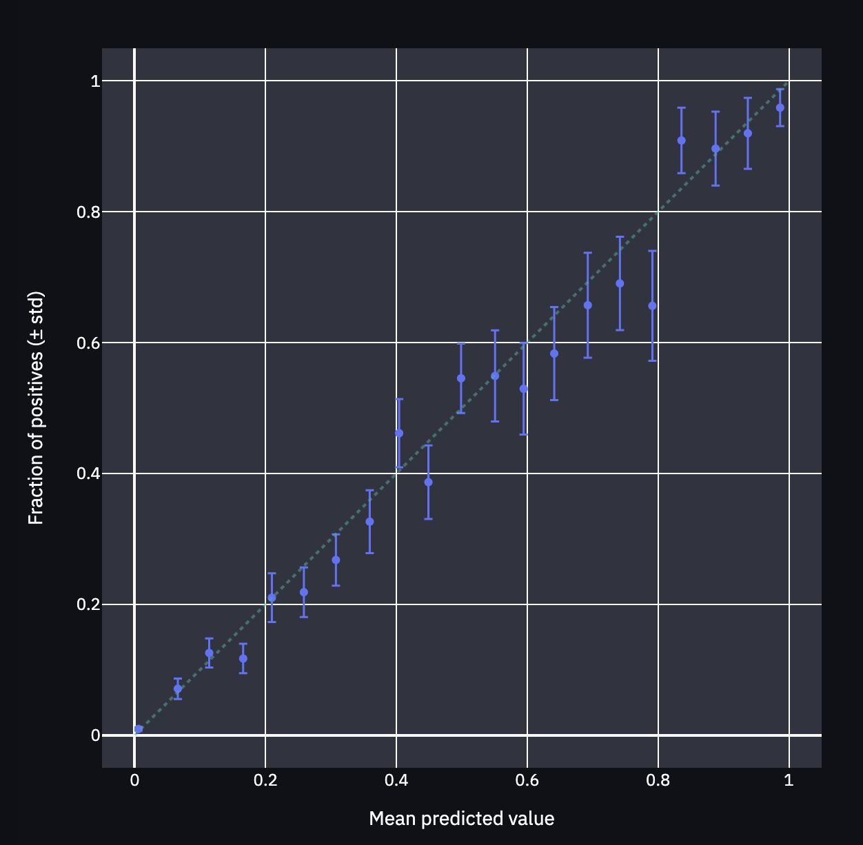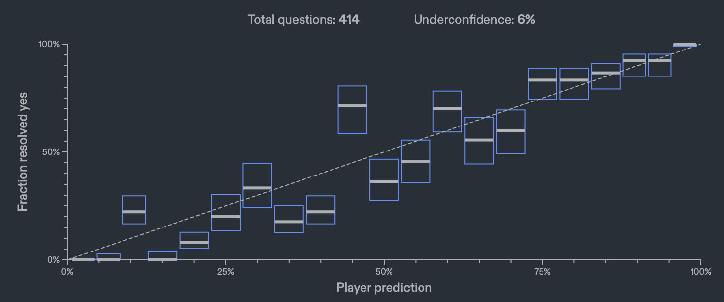 I might be a little underconfident? The blue rectangle in each bin represents the 50% confidence interval, and it looks like about 11 of the 20 rectangles contain the bin.