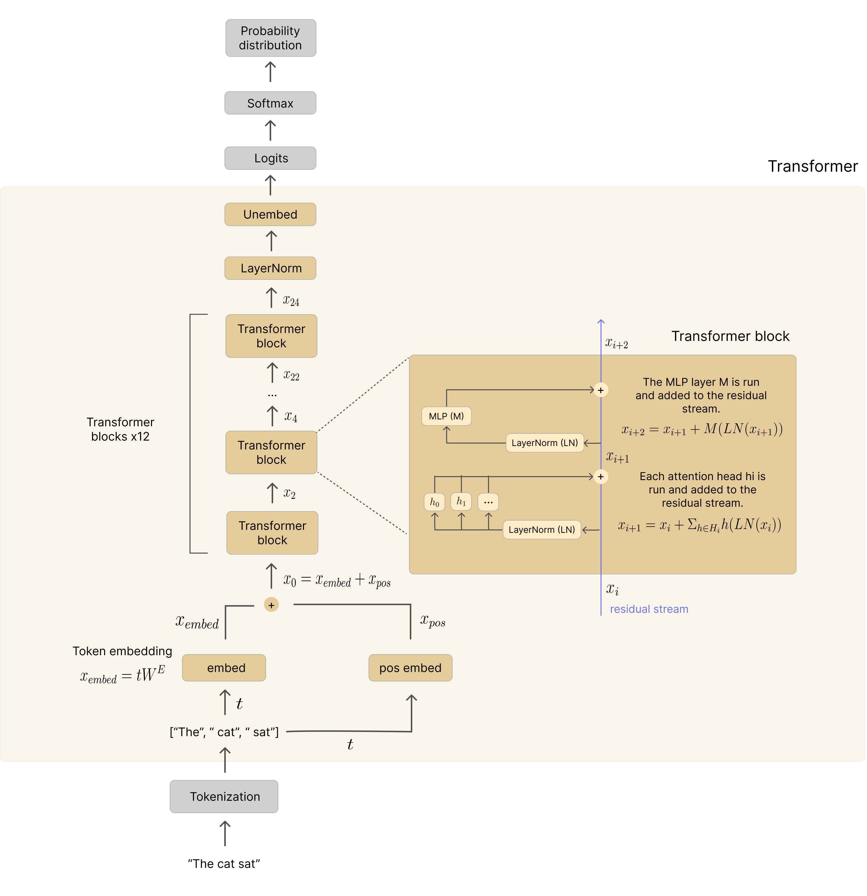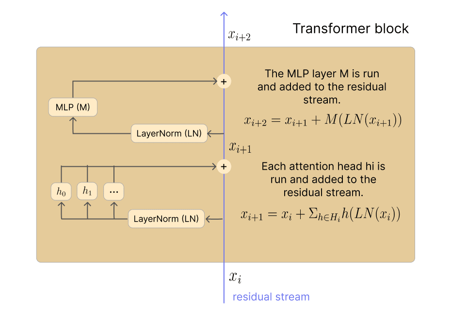 The residual stream: This is the central backbone of the transformer. It’s a list of vectors (one for each token) that flows through the model. Its shape is the same as the output of the embedding layer. The residual stream starts after the embedding layer and finishes at the unembedding layer.
