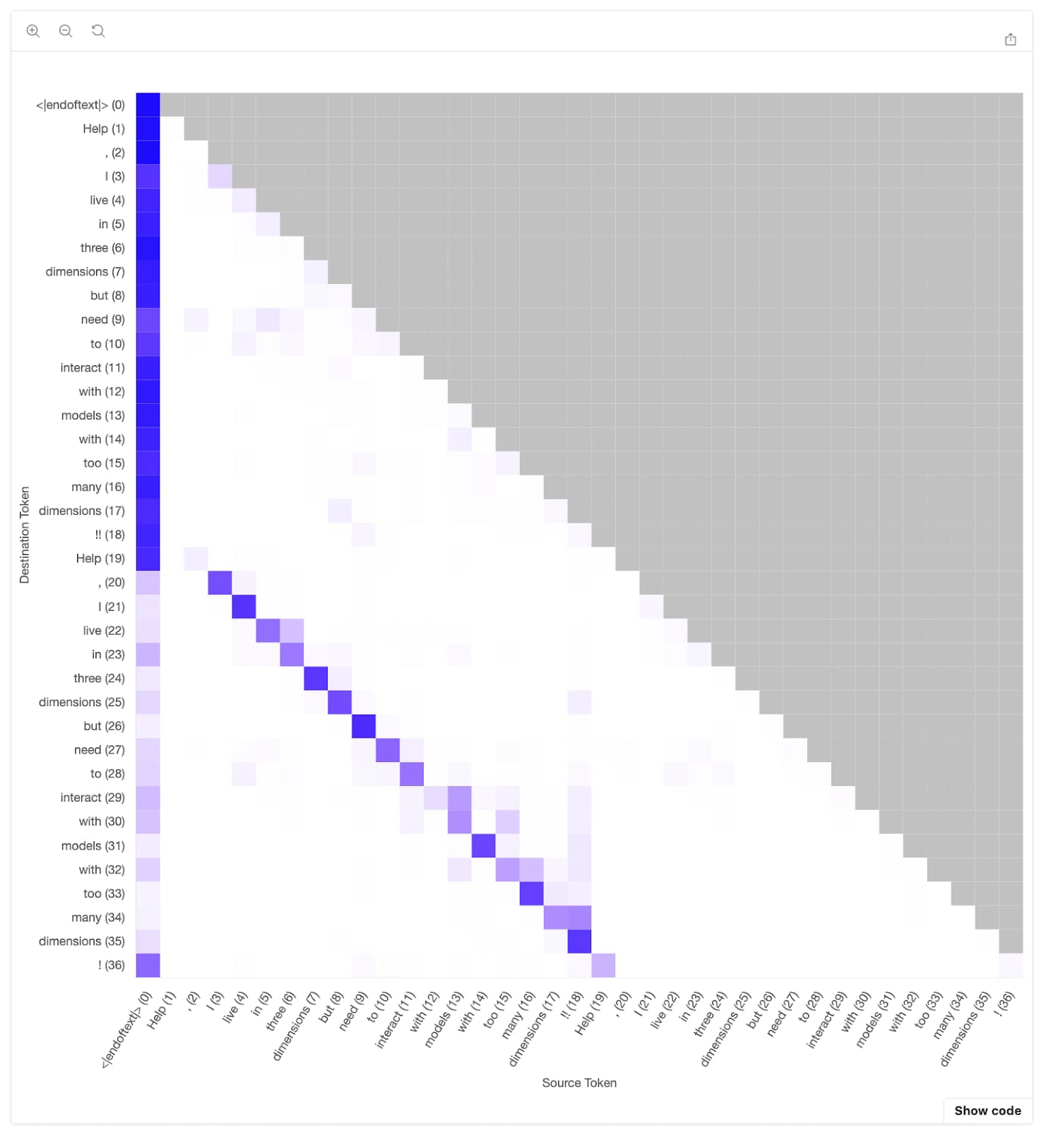 The off-center diagonal purple stripe in the triangular attention pattern (figure 7) is the result of induction heads. Each token in the repeated second sentence strongly attends to the next token of the sequence from the first sentence.