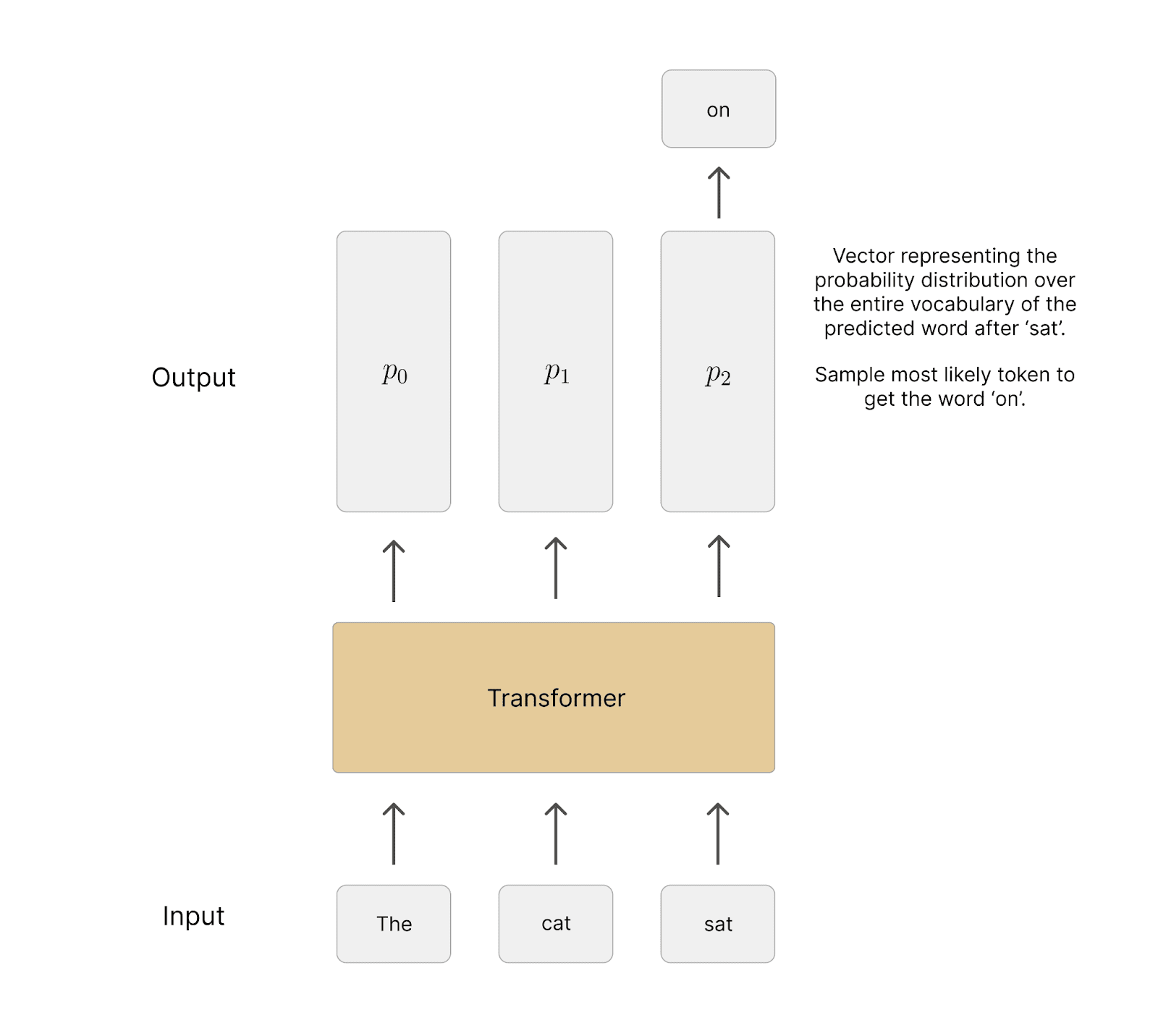 Initially the LLM receives a sentence as input such as “The cat sat”.