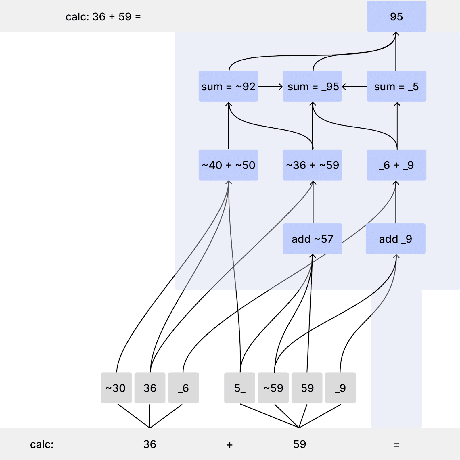 The two pathways work together to produce the correct answer: 95.