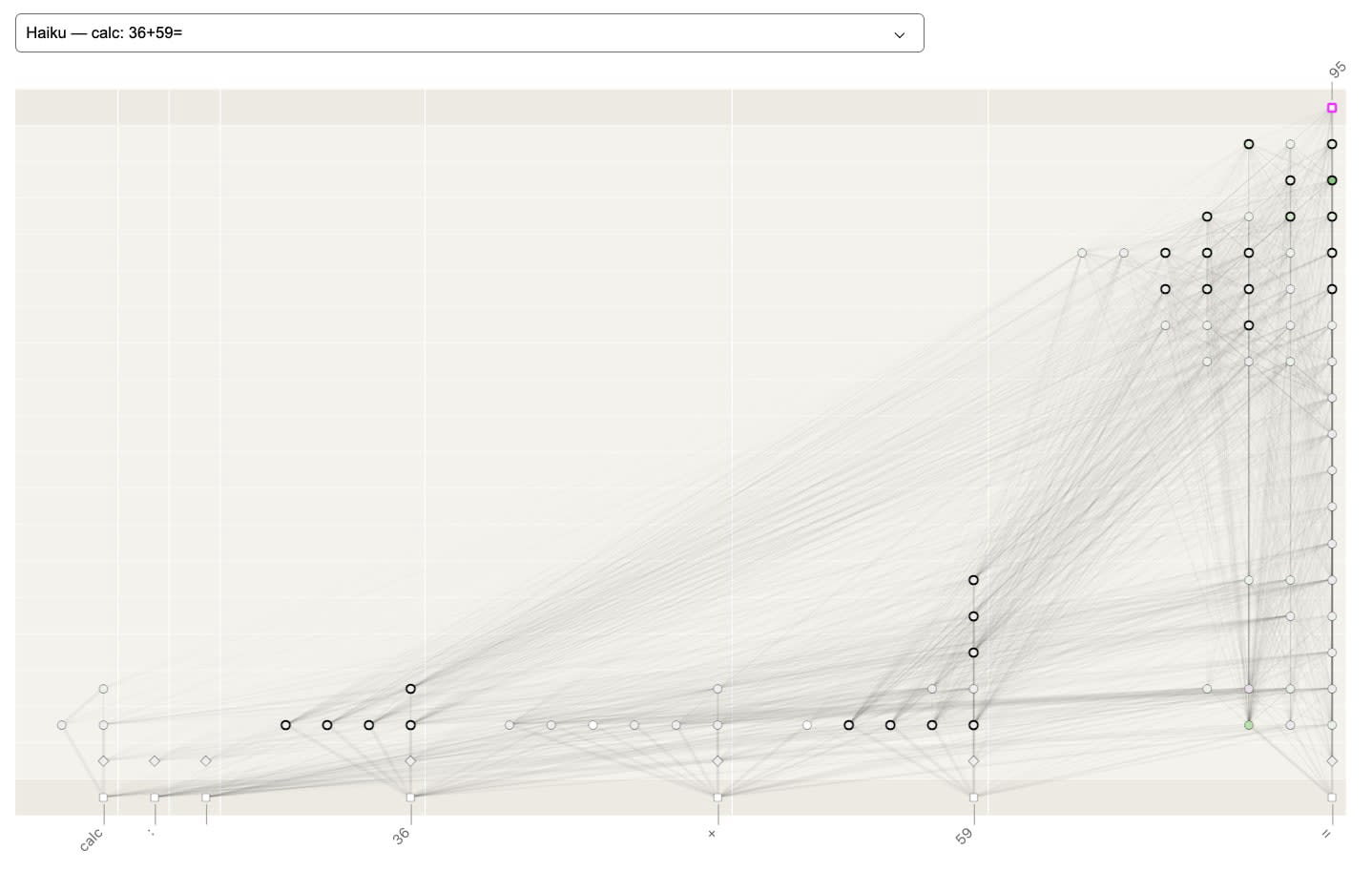 The two attribution graphs in this section show the features active at each position and layer for the prompt “calc: 36 + 59 = “. The first attribution graph is the original attribution graph and the second one is a simplified one showing the main supernodes in the graph.