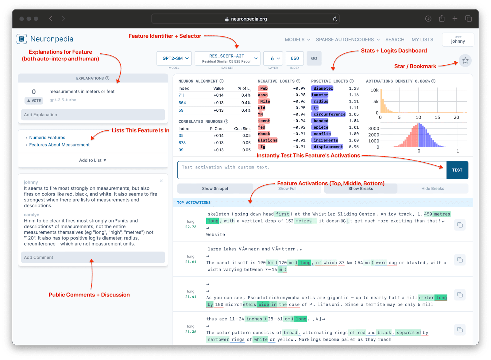 Input features: are found in low layers at the bottom of the graph and can be understood based on the input texts that highly activate them.